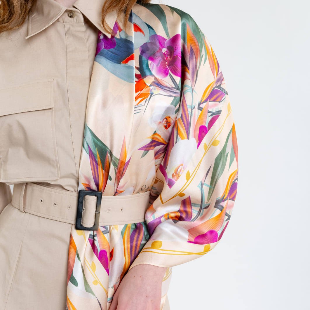Что понадобится: жилет или жакет, по желанию — ремешок на талию и платок EXOTIC BIRD. Яркий принт с экзотическими птицами становится центром композиции. Платок фиксируется поверх верхней одежды, а ремень подчёркивает силуэт, создавая завершённый и собранный образ.