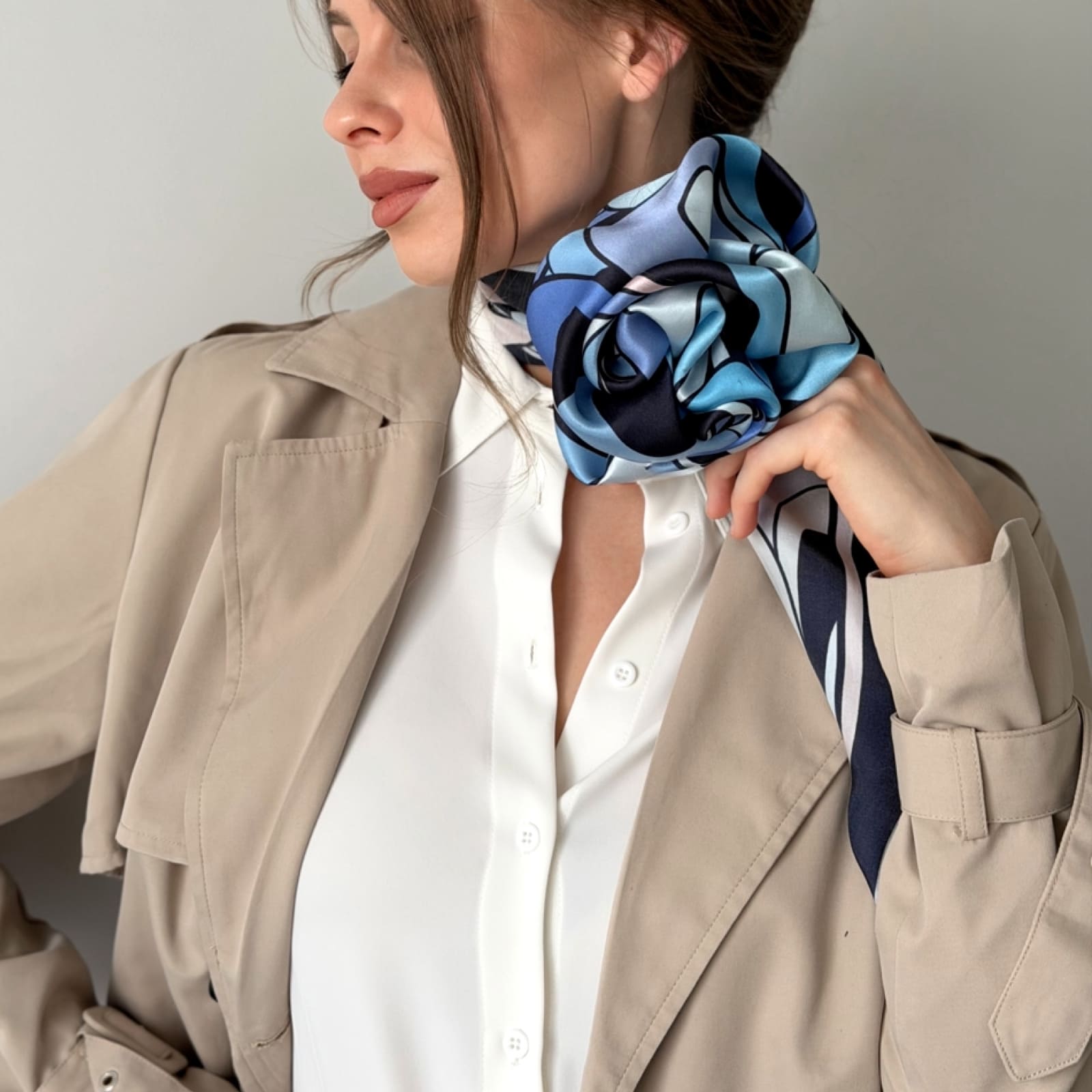 Шёлковый платок открывает безграничные возможности для стилизации. Представленные образы — лишь отправная точка для ваших экспериментов. Мы призываем не ограничиваться готовыми решениями: драпируйте ткань как лёгкий топ, акцентируйте линию талии, вплетайте в укладку или используйте как деликатный декор для сумки. Универсальность аксессуара раскрывается именно в вашей индивидуальной подаче.