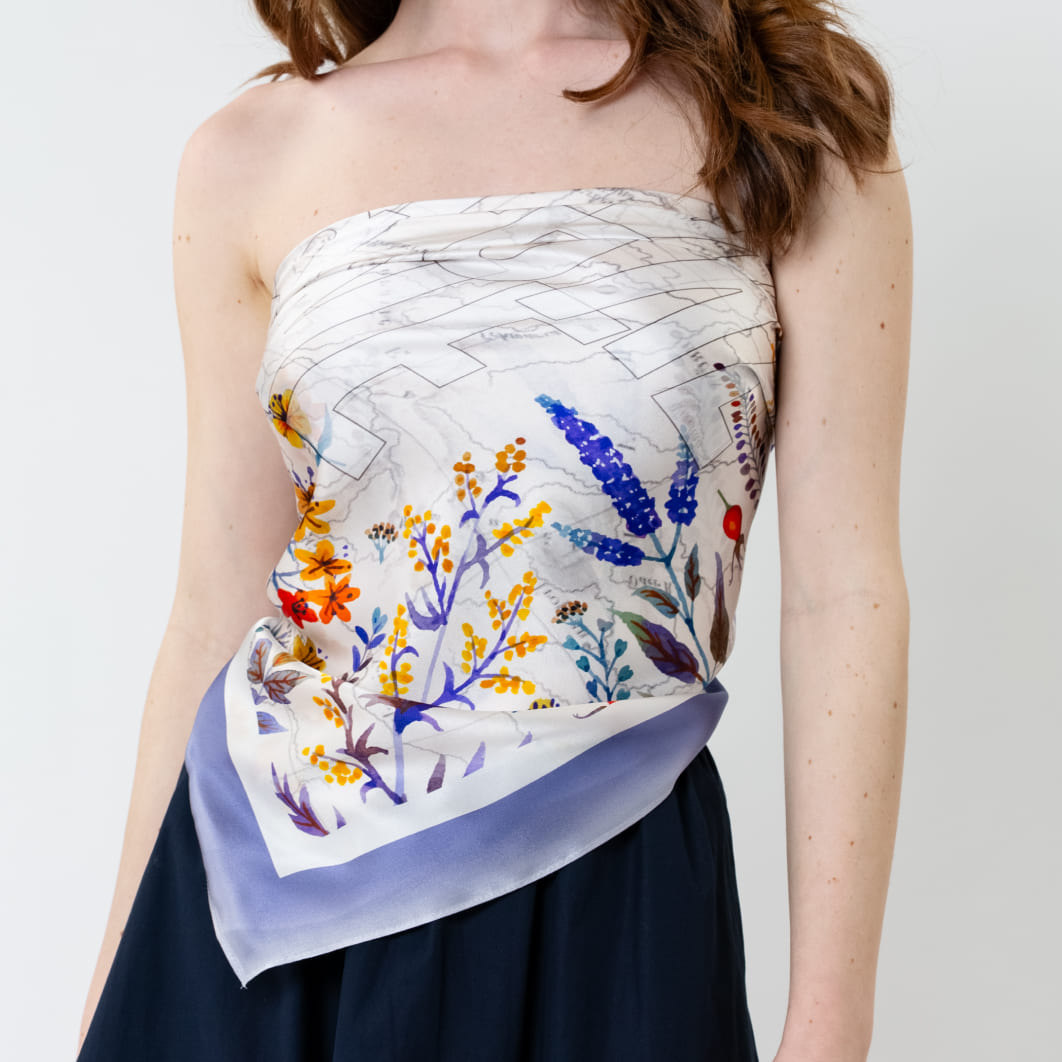 Изящный способ ввести платок в образ без лишних деталей. Летний флористический принт и картографические мотивы на кремовом фоне платка FLORA говорят сами за себя, акцентируя внимание на качестве материала и чистоте линии.